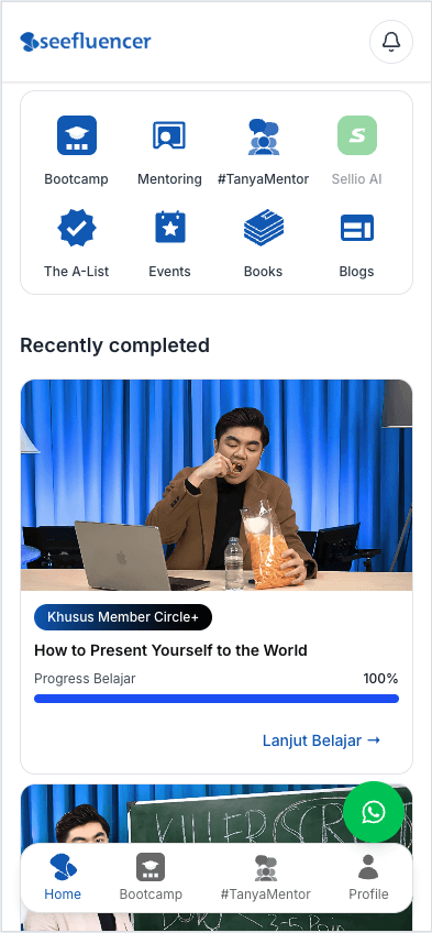 Mentoring setiap hari via Zoom bersama mentor Seefluencer untuk bedah konten, revisi script, dan praktik langsung bersama.