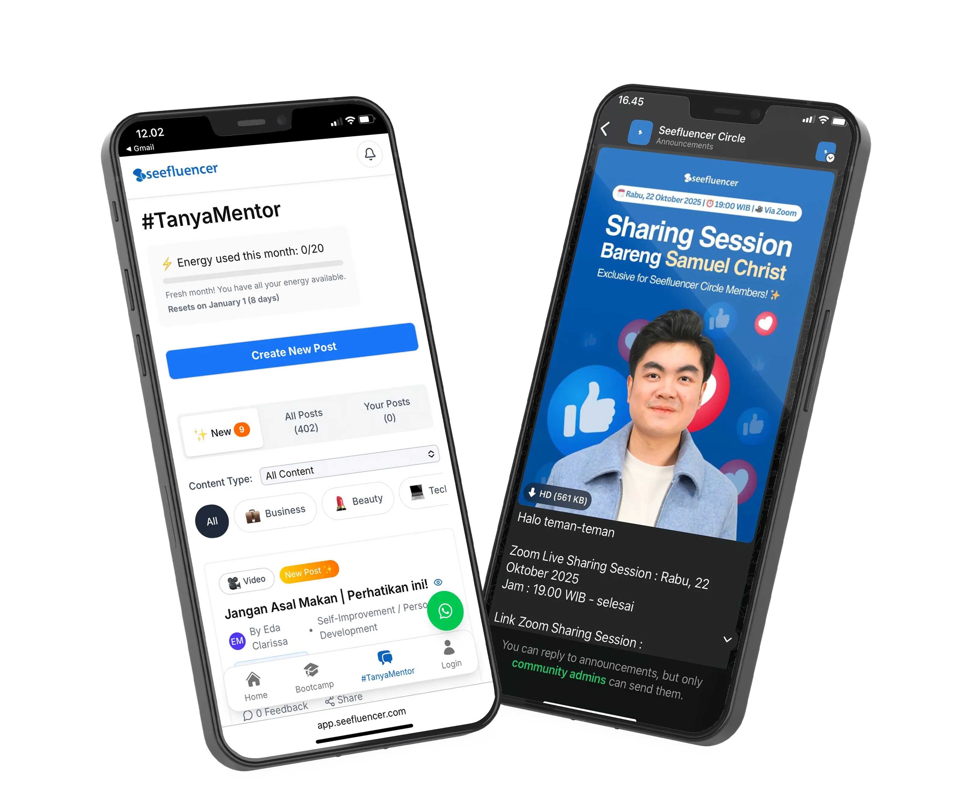 Live Mentoring setiap hari via Zoom bersama mentor Seefluencer untuk bedah konten, revisi script, dan praktik langsung bersama.